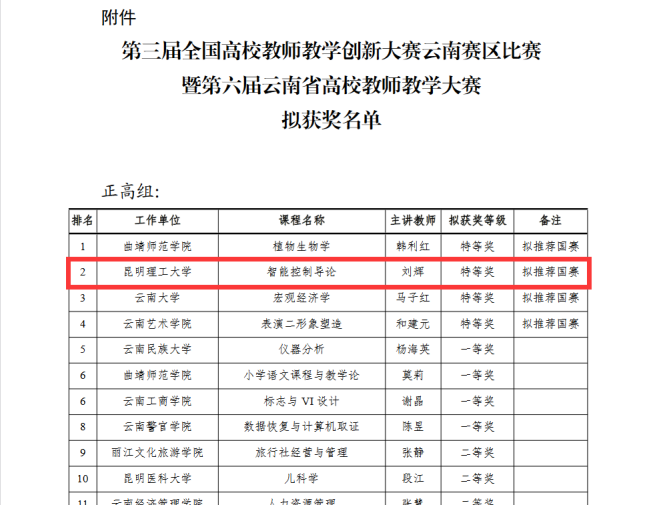 教师刘辉教授拟荣获此次教学大赛特等奖,拟推荐参加国赛,主讲课程《智能控制导论》。