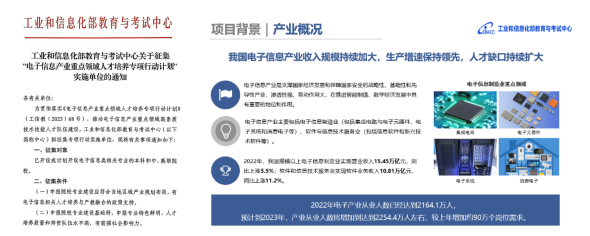 为响应工业和信息化部教育与考试中心(以下简称“工信部教考中心”)发布的《关于征集“电子信息产业重点领域人才培养专项行动计划”实施单位的通知》,贯彻《电子信息产业重点领域人才培养专项行动计划》(工信教[2023]68号)工作,落实一流专业建设工作,推动电子信息产业重点领域高素质技术技能人才队伍建设。