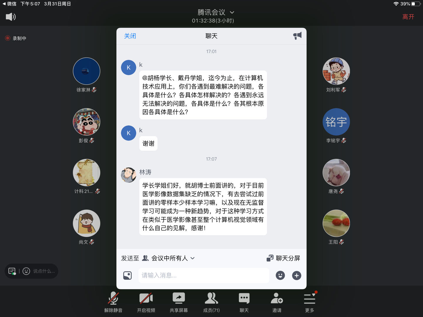 最后,参会师生展开了热烈的线上讨论。两位博士积极发表自己的看法,同学们通过本次讲座了解到学术的纯粹性以及要从实际应用和实际数据中找科学问题研究,并获取了考研考博的经验。本次活动也在浓烈的学术交流氛围中落下了圆满的帷幕,不仅激发了同学们的科研热情和信心,也让他们对未来的学术生涯有了更明确的规划和期待。