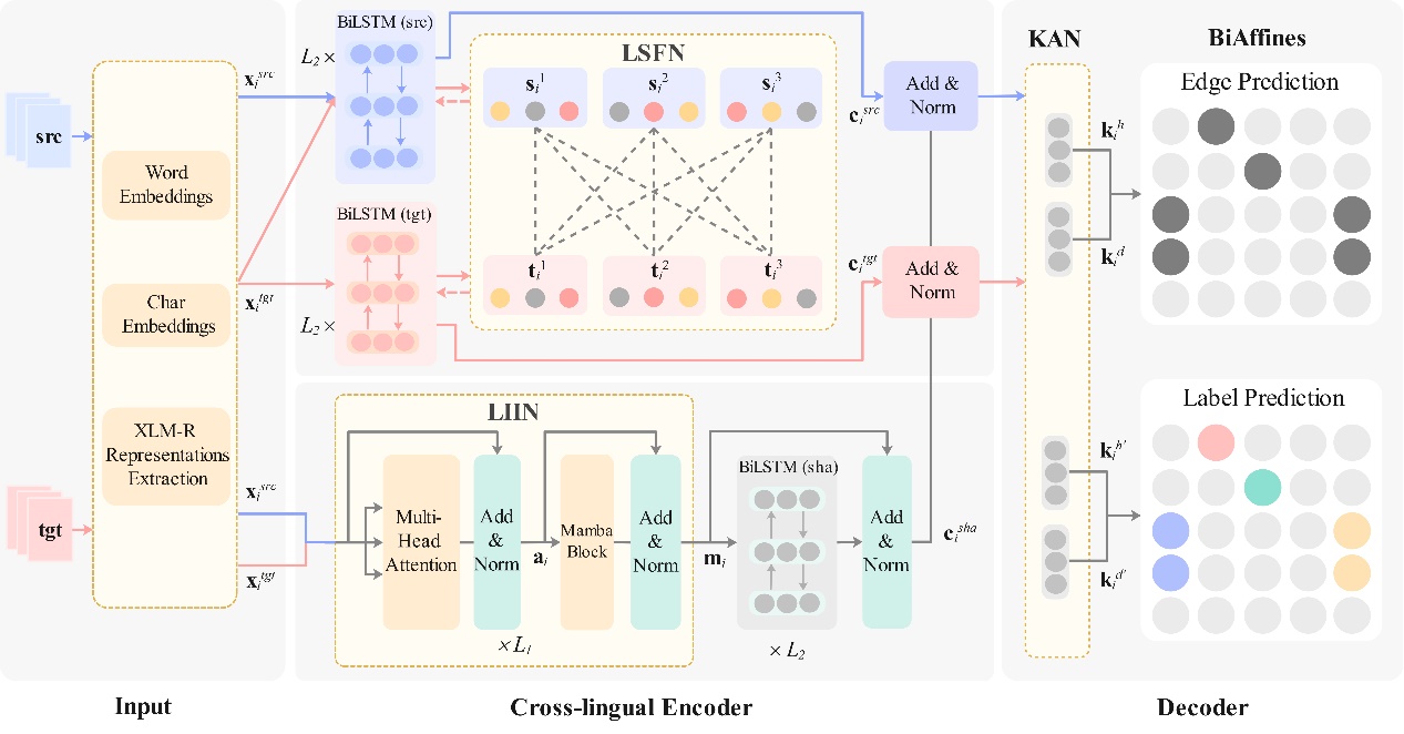 论文简介:依存句法分析(dependency parsing),作为自然语言处理中的关键技术之一,旨在分析输入句子的句法和语义信息。虽然通过预训练语言模型增强的依存句法分析器在富资源语言中取得了出色的表现,但其性能在低资源语言中会显著下降。跨语言依存句法分析尝试从富资源语言中学习丰富且有用知识来弥补低资源语言句法信息不足的问题。然而,如何减少不同语言之间的句法结构分布偏差和深度挖掘语言之间的共性依然是跨语言句法分析的巨大挑战。为了解决这些问题,本文在传统的共享-私有模型基础上提出了新颖的语言特定句法特征过滤网络(language-specific syntactic feature filtering network, LSFN)和语言不变句法特征注入网络(Language-invariant syntactic feature injection network, LIIN)。本文在七个低资源语言数据集(越南语、维吾尔语、泰语、沃洛夫语、科普特语、马耳他语和泰米尔语)上进行了实验,实验结果表明与原始的共享-私有模型相比,本文的模型在七种语言上平均取得了1.84的未加标签依存关系准确率(UAS)和3.43加标签依存关系准确率(LAS)的得分提升。对比实验证明了本文提出的LSFN和LIIN模块在有益知识从源语言迁移到目标语言方面具有互补性。详细的分析实验表明本文的模型能够有效捕捉不同语言之间的公共特征,大幅度缓解语言分布偏差带来的负迁移,进一步展现出本文模型的鲁棒性和有效性。