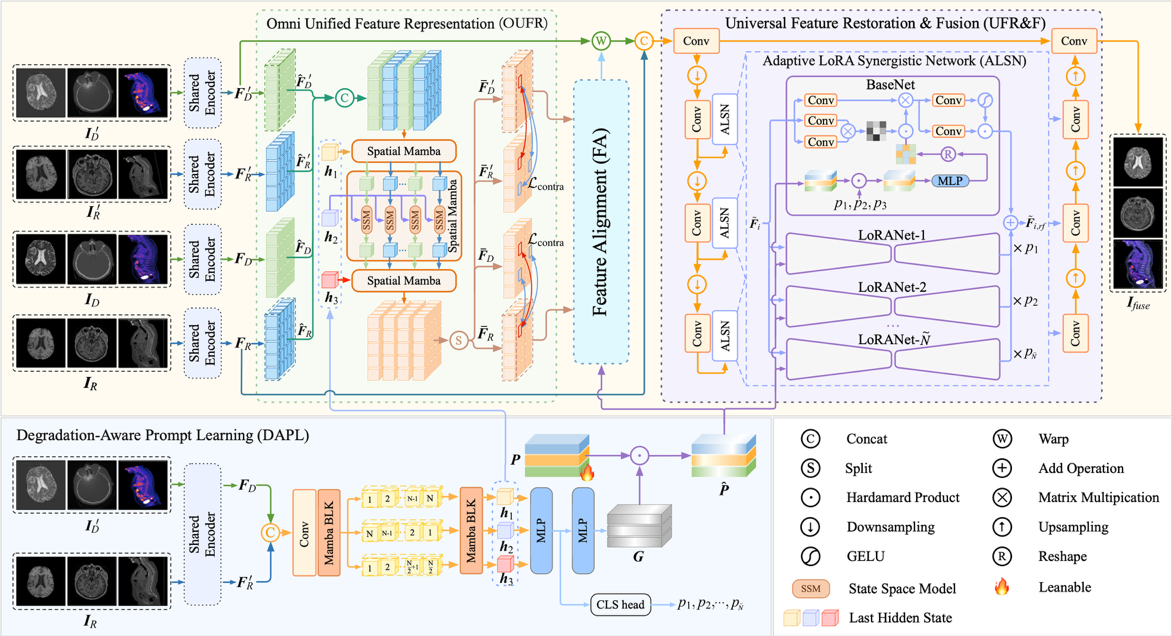 论文简介:当前的多模态医学图像融合方法通常假设源图像具有高质量并在像素级上完全对齐,其性能在很大程度上依赖于这一前提条件,在处理失配或退化图像时效果显著下降。为了解决这一问题,我们提出了一个通用融合框架——UniFuse。该框架引入了一个感知退化的提示学习模块,能够从输入图像中无缝整合多方向信息,并将跨模态对齐与图像修复任务关联起来,实现两者在统一架构下的联合优化。此外,我们设计了全向统一特征表示机制,利用Spatial Mamba对多方向特征进行编码,有效缓解模态差异带来的对齐误差。为了实现图像修复与融合的一体化处理,我们提出了通用特征修复与融合模块,并引入基于LoRA原理构建的自适应LoRA协同网络,利用其自适应特征表示能力和退化类型感知机制,在单阶段框架中实现了图像修复与融合的联合优化。与传统的分阶段方法相比,UniFuse在对齐、修复和融合方面实现了真正的一体化。多个数据集上的实验结果表明,该方法在性能上显著优于现有方案。