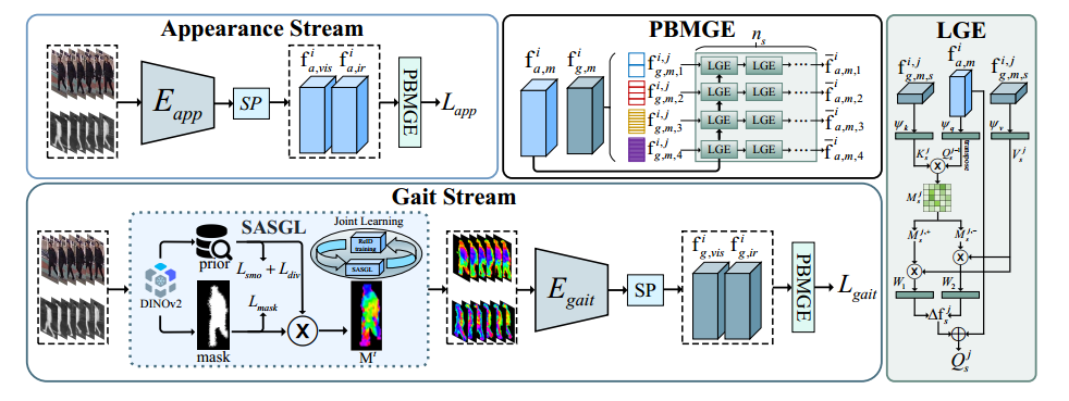 论文简介:基于视频的可见光-红外人员重新识别(VVI-ReID)旨在从视频序列中跨可见光和红外模态检索同一行人。现有方法倾向于利用模态不变的视觉特征,但在很大程度上忽略了步态特征,这些特征不仅是模态不变的,而且具有丰富的时间动态,从而限制了它们对跨模态视频匹配至关重要的时空一致性进行建模的能力。为了应对这些挑战,我们提出了一个 DINOv2 驱动的步态表示学习(DinoGRL)框架,该框架利用 DINOv2 丰富的视觉先验来学习与外观线索互补的步态特征,从而促进跨模态检索的稳健序列级表示。具体来说,我们引入了一种语义感知轮廓和步态学习(SASGL)模型,该模型使用 DINOv2 中的通用语义先验生成和增强轮廓表示,并与 ReID 目标共同优化它们,以实现语义丰富和任务自适应步态特征学习。此外,我们开发了一个渐进式双向多粒度增强 (PBMGE) 模块,该模块通过跨多个空间粒度实现步态和外观流之间的双向交互来逐步细化特征表示,充分利用它们的互补性来增强具有丰富局部细节的全局表示并产生高度区分的特征。在 HITSZ-VCM 和 BUPT 数据集上的大量实验证明了我们方法的优越性,其明显优于现有的最先进方法。