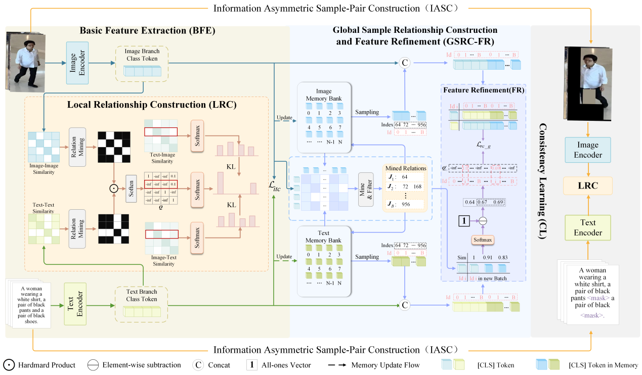 论文简介:弱监督文本到图像的行人匹配是减少模型对大规模人工标注样本依赖的重要方法,具有重要的研究价值。然而,现有方法难以预测复杂的一对多身份关系,严重限制了模型性能的提高。为了应对这一挑战,我们提出了一种局部和全局双粒度身份关联机制来克服这些瓶颈。具体来说,在局部层面,我们明确建立批次内的跨模态身份关系,加强不同模态之间的身份约束,使模型能够更好地捕捉细微差别和相关性。在全局层面,我们构建了一个以视觉模态为锚点的动态跨模态身份关联网络,并引入了一种基于置信度的动态调整机制,有效增强了模型识别弱关联样本的能力,同时提高了整体敏感度。此外,我们还提出了一种信息不对称样本对构建方法,结合一致性学习来解决难样本挖掘问题,以增强模型的鲁棒性。实验结果表明,所提出的方法大大提高了跨模态匹配的准确性,为文本到图像的行人匹配提供了高效实用的解决方案。