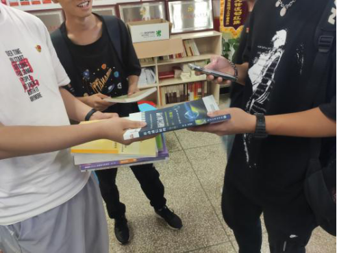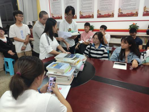 交流结束后,支部党员向新生捐赠课本教材,一方面可以对课本资源进行循环使用,同时还可共享课本上的笔记;另一方面也可以缓解新生购买教材时不知教材版本的尴尬,同时减少他们去二手书店买教材的成本。