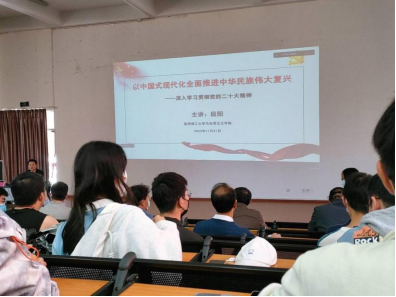 此次主题党日活动以党课形式开展,主题是“以中国式现代化全面推进中华民族伟大复兴——深入学习贯彻党的二十大精神”,课程由马克思主义学院党委副书记、副教授段阳同志主讲。段阳老师带领全体党员原原本本,逐字逐句学习党的二十大报告和党章,学习领会党的二十大精神。党员们在段阳同志的分享和讲解下,学习党过去五年的工作和新时代十年的伟大变革,学习了新时代十年伟大成就取得的根本原因、深刻领会了新时代新征程中国共产党的使命任务和中国式现代化的中国特色和本质要求,及党在新时代的新举措和重大战略部署。
