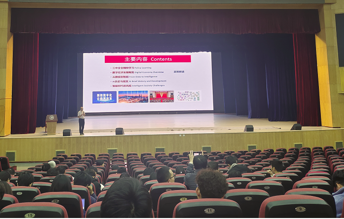 高飞教授从党的二十届三中全会精神学习、数字经济发展概览、从数据到智能、AI历史与现实及智能时代的风险五个方面为师生们进行了详细的政策解读、数据呈现、前沿科普和数据风险警示讲授。