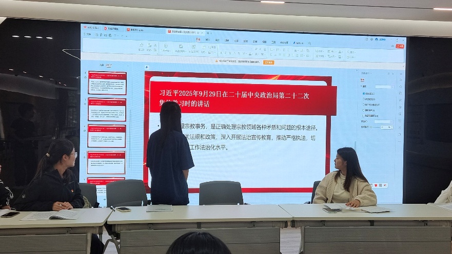 在活动第一阶段,党支部书记万松同志组织全体党员深入学习贯彻习近平总书记关于加强和改进民族工作的重要思想、关于宗教工作的重要论述,并集中学习《互联网宗教信息服务管理办法》和《宗教事务条例》,重点解读了法规的核心内容和实践要求,引导党员从法治角度深刻认识宗教事务管理的重要性。