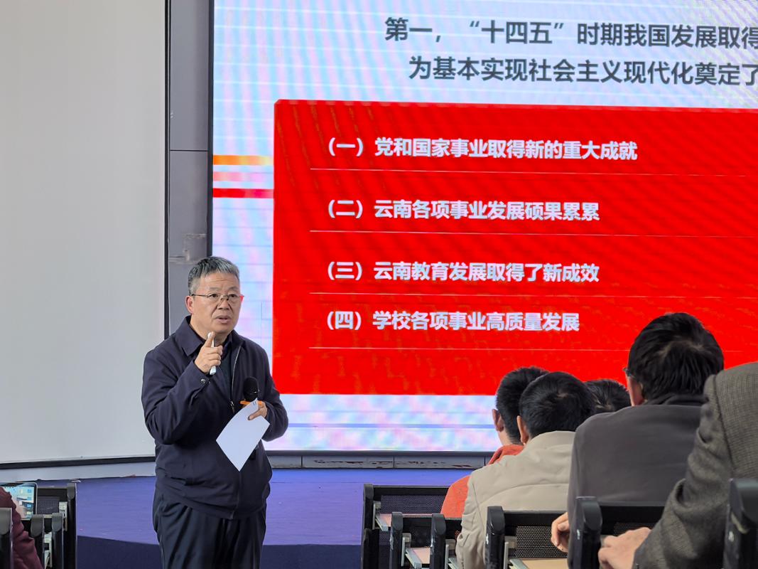 宣讲中,蔡金红副书记结合国家发展成就、云南区域进步和学校实际,系统回顾了“十四五”以来党和国家事业取得的重大成就,特别是教育领域的历史性进展。他指出,“十五五”时期是夯实基础、全面发力的关键阶段,教育承担着基础性、先导性和全局性作用。面对新征程,全校教职工要深刻领会全会精神,坚定发展信心,准确把握学校在教育强国、教育强省中的定位,充分发挥学科、科研和人才优势,服务国家战略与区域发展。
