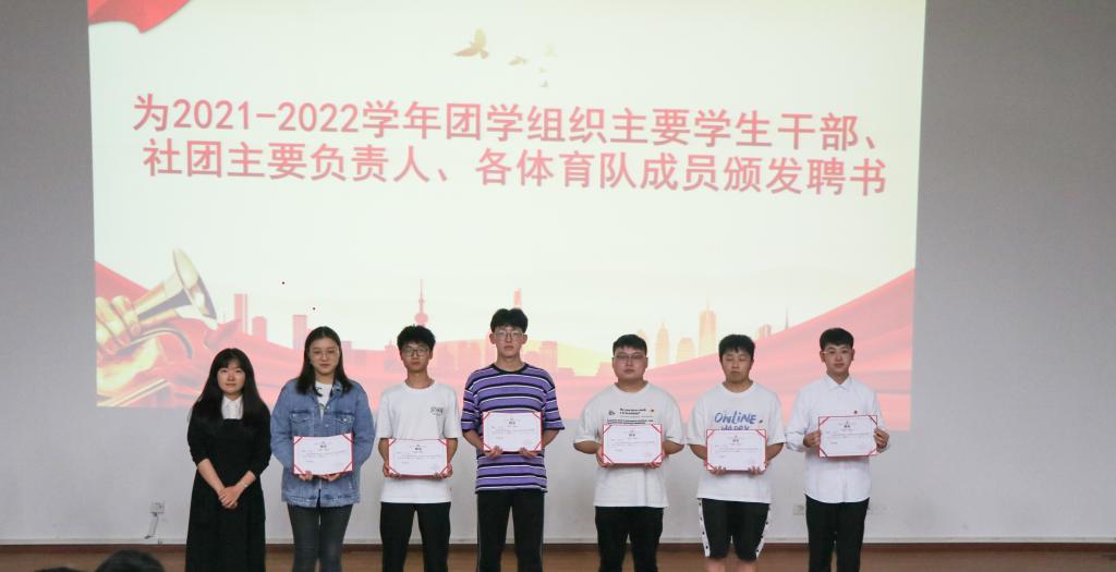 伴随着庄严的中国共产主义青年团团歌《光荣啊,中国共青团》,本次大会拉开了序幕。首先,团委万松老师、学生会陈泽文主席分别为2021-2022学年团学组织主要学生干部、社团主要负责人、各体育队成员颁发聘书。紧接着,主持人宣读了新一届团委学生会学生干部、社团主要负责人、各体育队队员名单。随后,由上一届学生干部代表学生会主席陈泽文上台发言,对过去一年学生会工作进行了回顾与总结,同时表达了对新一届学生组织全体成员的祝福和期望。接下来,新一届学生干部代表黄德以、学院足球队队长黄辉波依次上台发言,表达了他们对做好未来工作的态度与决心,以及为学院燃烧青春、奉献力量的热血。之后,新一届学生干部为老一届学生干部鲜花,表达对老一届团委学生会干部的感谢。最后,万松老师在大会上致辞,希望大家撸起袖子加油干,做奋发向上的有为青年,充分发挥当代青年的主人翁责任感与使命感,为校、为国献出自己的一份力量!至此,本次换届大会圆满结束。