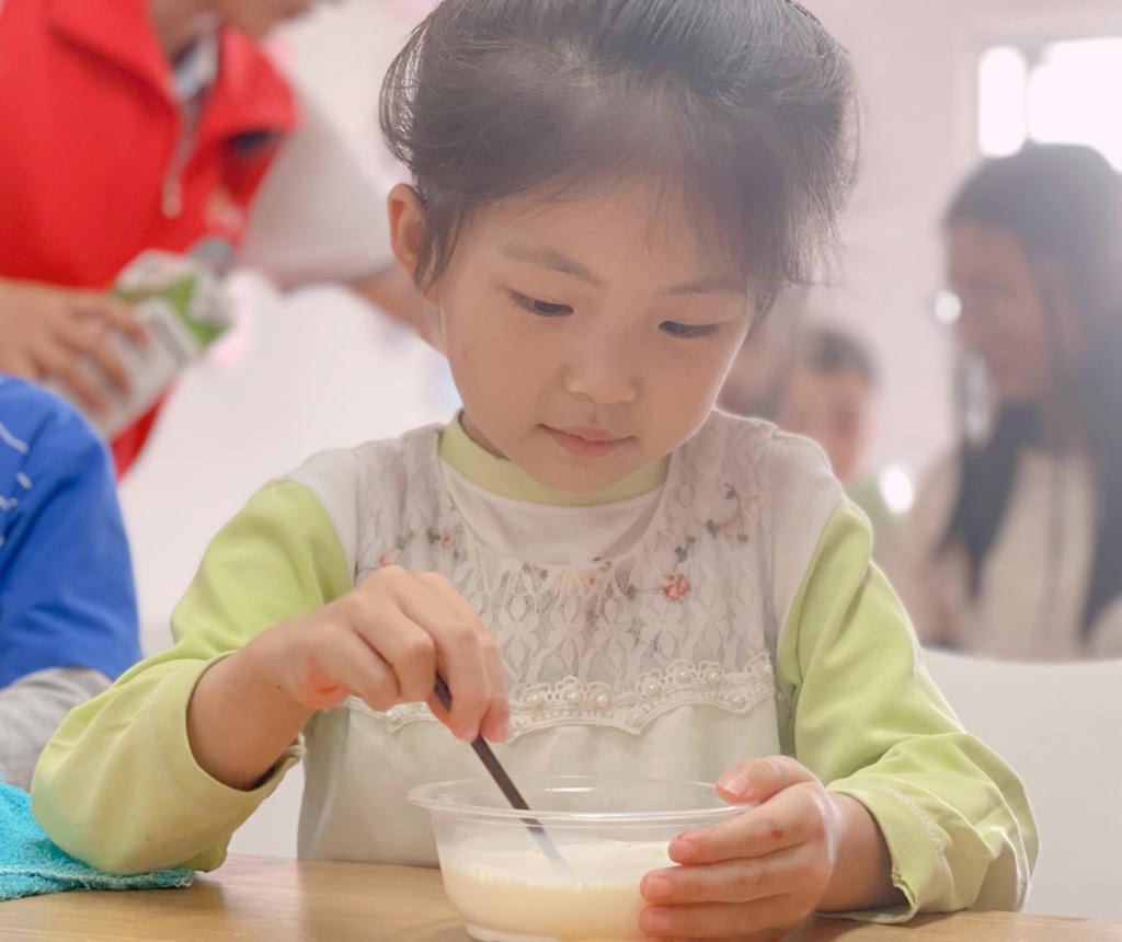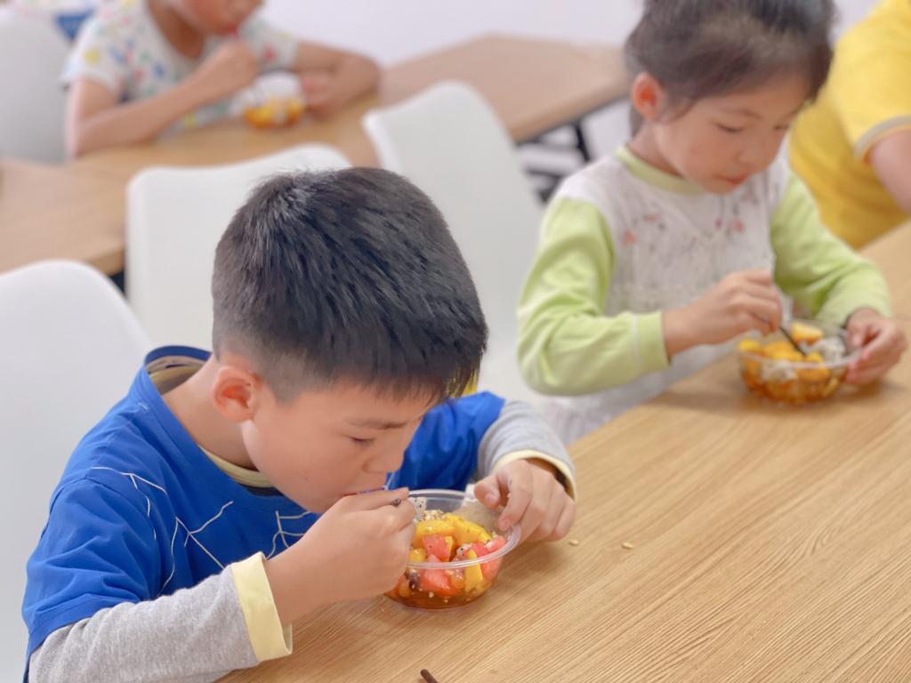 本次活动共制作了两种美食,分别是“蛋挞”和“水果冰粉”。活动现场,志愿者细心讲解并演示制作方法,小朋友们在志愿者的指导下动手实操,充分感受到了制作食物时的期待和喜悦。最后,志愿者将制成的蛋挞和水果冰粉分发给每一个小朋友,让他们品尝自己做的美食。