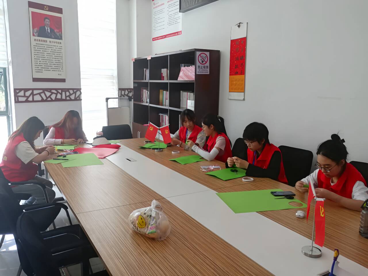 活动中,志愿者们运用多媒体技术生动形象地介绍了井冈山的历史渊源、革命斗争的艰辛历程以及井冈山精神的重要内涵。同时,观看了关于井冈山精神的讲解视频,志愿者分享他们对于视频内容的所思所感,带领社区小朋友学习绘画党徽并动手制作红军帽。