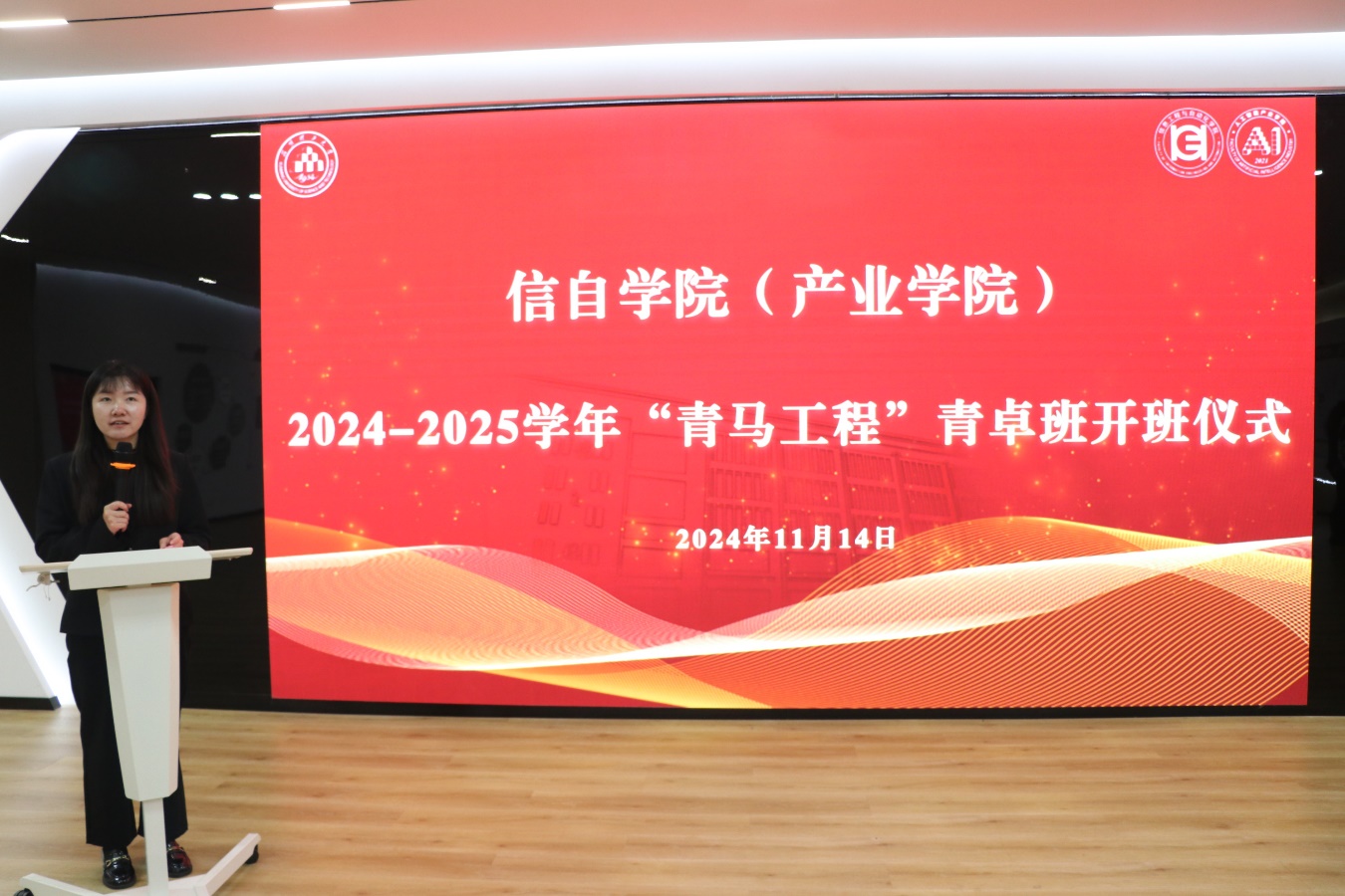 (人工智能产业学院)在信自楼126报告厅举行2024-2025学年“青马工程”青卓班开班仪式。本次开班仪式由院团委书记万松主持,院党委副书记郑婷婷出席,2024级新生团支书及全体青卓班学员参加。