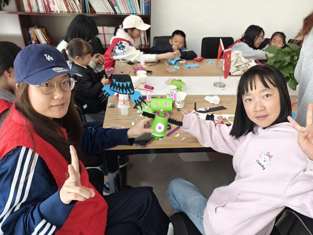 本次活动以“以指尖为笔,勾勒科创奇思;以手工为翼,承载逐梦初心”为理念,志愿者首先向孩子们介绍机器人的基本原理和简单的机械知识。随后,志愿者与儿童一对一合作,用纸杯、彩纸、吸管、胶水等材料创作属于自己的机器人。过程中志愿者鼓励孩子们发挥创意,自主设计机器人造型,并在其旁边耐心协助完成裁剪和胶水的使用。完成制作后,每组展示作品并分享创作思路。整个过程不仅培养了孩子们的动手能力和创作力,也在互动中拉近了志愿者与儿童的距离。